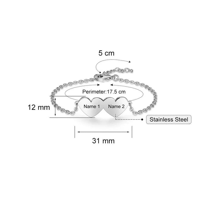 This Love in line -2 Custom Name chain Bracelet is a meaningful present for mothers, sisters, friends, or significant others. Made from sterling silver, the personalized bracelet features two hearts joined together, each with a special name engraved. The lobster clasp design allows for adjustable sizing to fit perfectly on your wrist. Give a thoughtful and caring gift by choosing our custom-made jewelry. In search of an engravable present? Look no further!