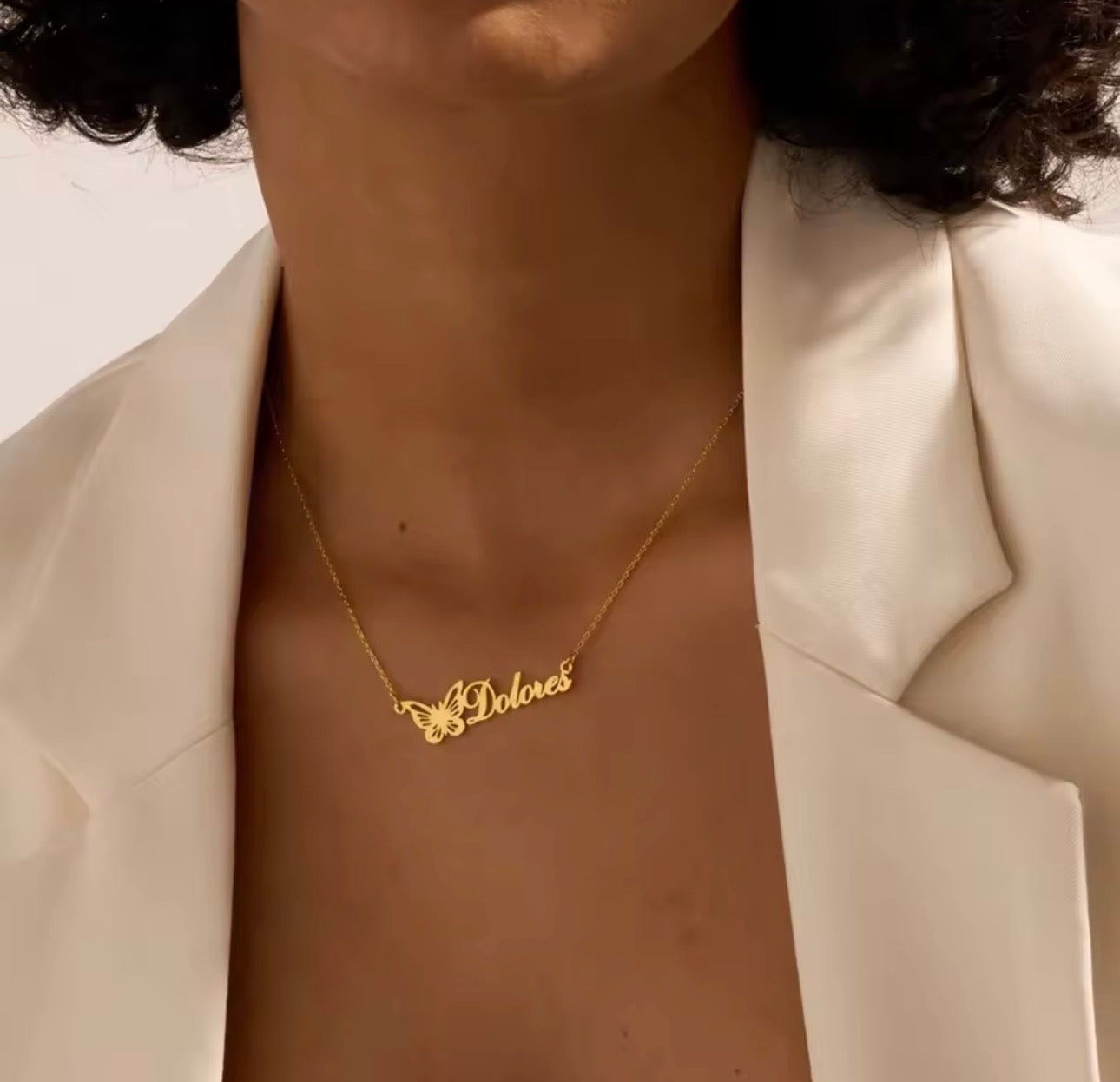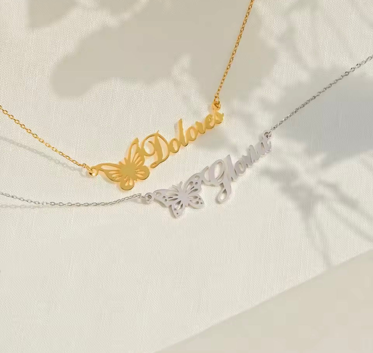 This custom Ink Butterfly necklace features a beautiful butterfly pendant with your chosen name. Crafted with precision, this unique piece adds a personal touch to any outfit. Made from quality materials, it's an elegant addition to your jewelry collection. Order now and enjoy stylish customization!